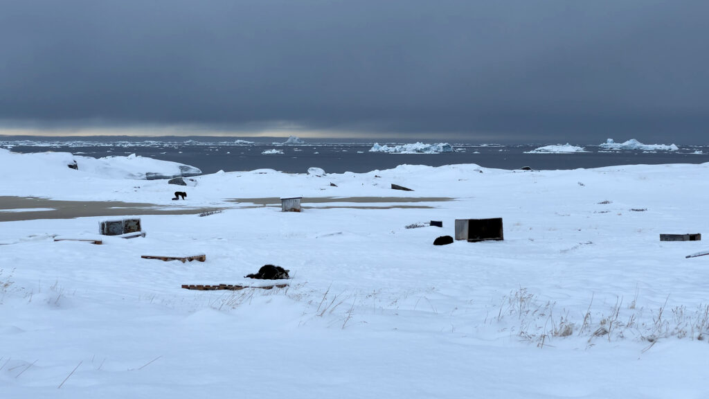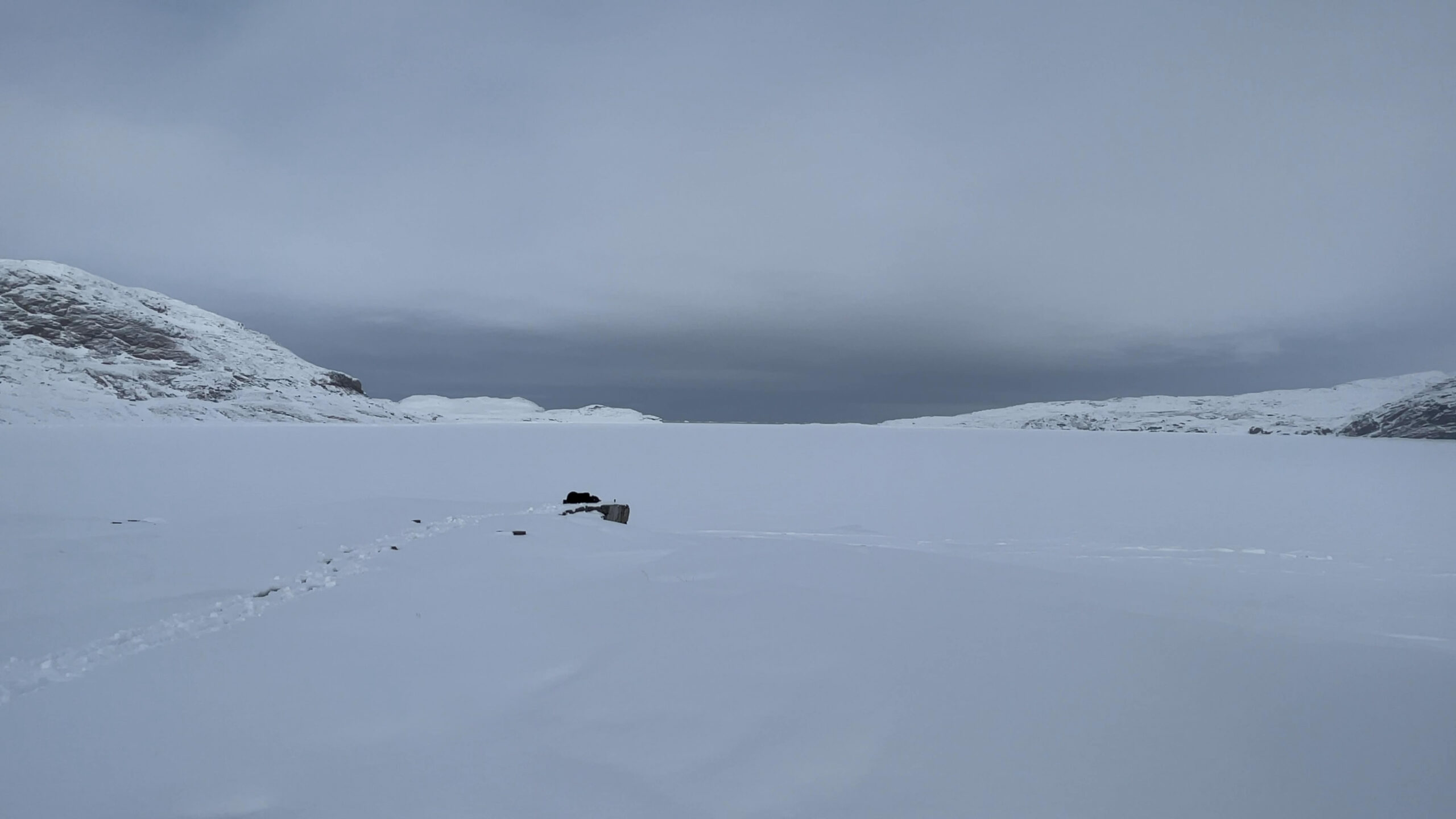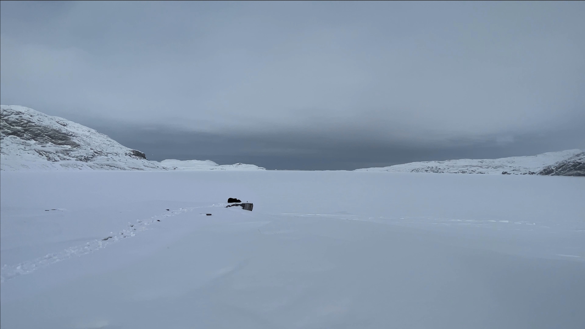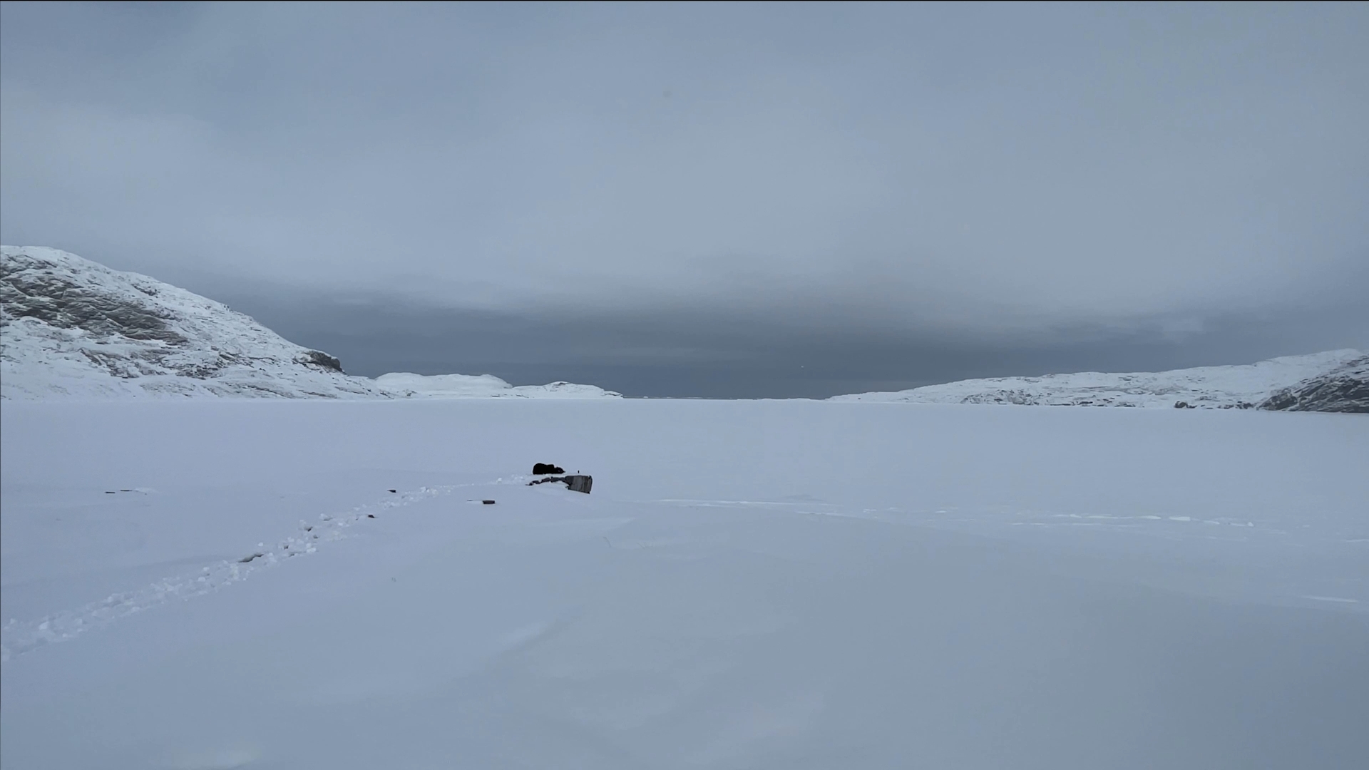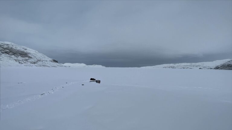 The series of performances initiated at the Oqaatsut residency is an extension of my earlier creative explorations. In a post-humanist spirit, I look at the relationship of humans to other species. This time I was interested in dogs, which occupy a special place in Greenland, both as service animals and as characters in tales and legends. Dogs are unique creatures. As the only domesticated animals in Greenland, they provided a link between the world of humans and wildlife. The short videos capture both my romantic longing to be closer to nature and touch on the theme of the transformation of humans into animals, often present in Greenlandic legends. During the expeditions, which lasted throughout the residency, I experienced the terrain on two as well as four limbs, which expanded the context of the work to include the experience of the body, not only at the level of perceived cold, but also in relation to the sense of balance and non-human perception. In addition, each shot is accompanied by an aura of mystery and ambiguity. Depending on the scale, the figure appears as a hard-to-define, four-legged creature, a human-animal hybrid, a woman-dog, a disappearing black shape.