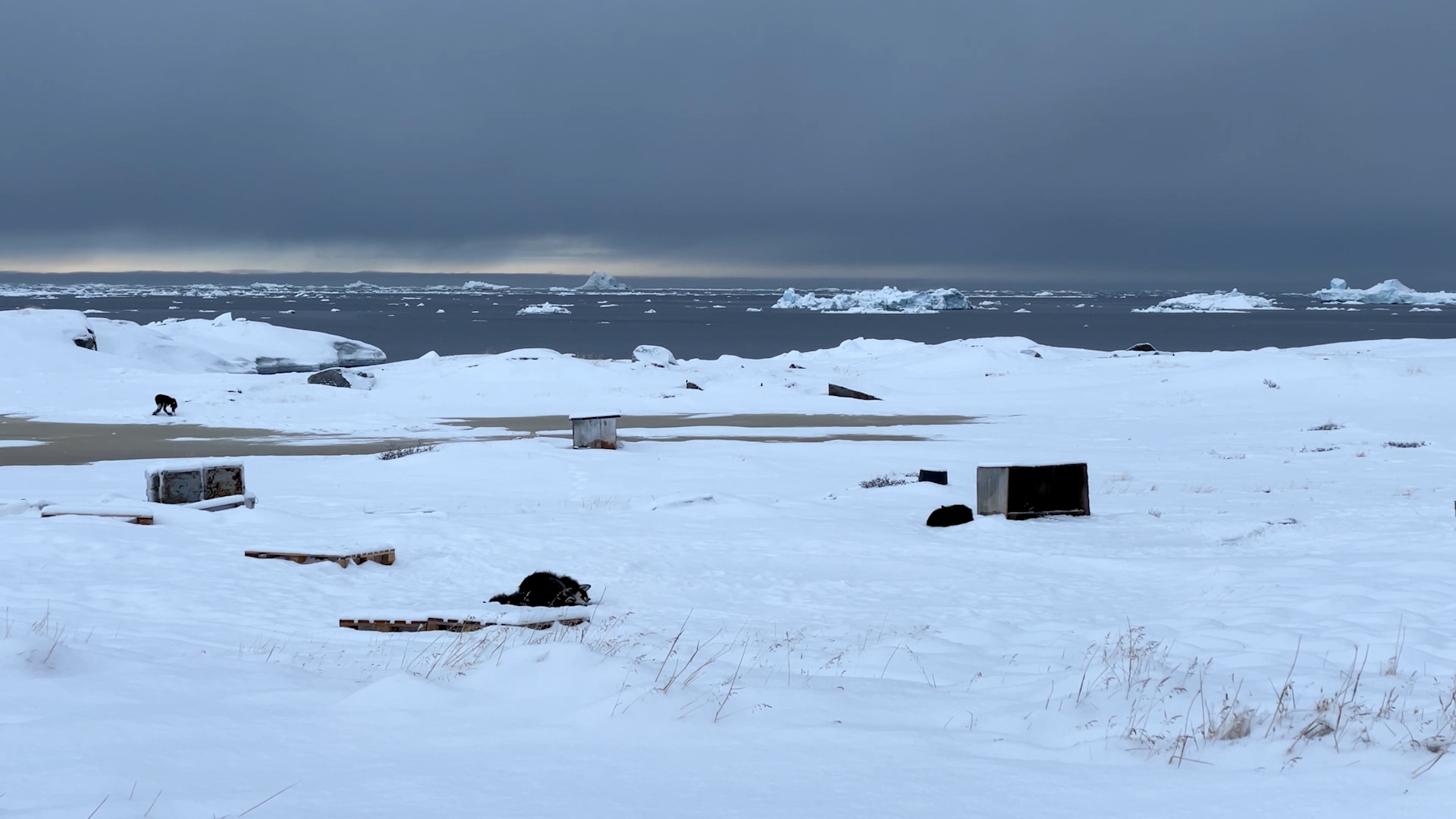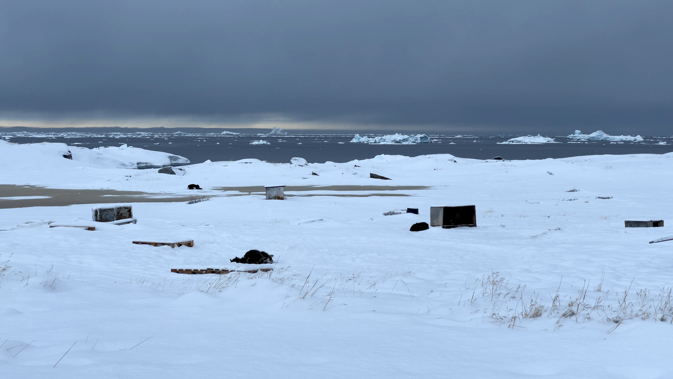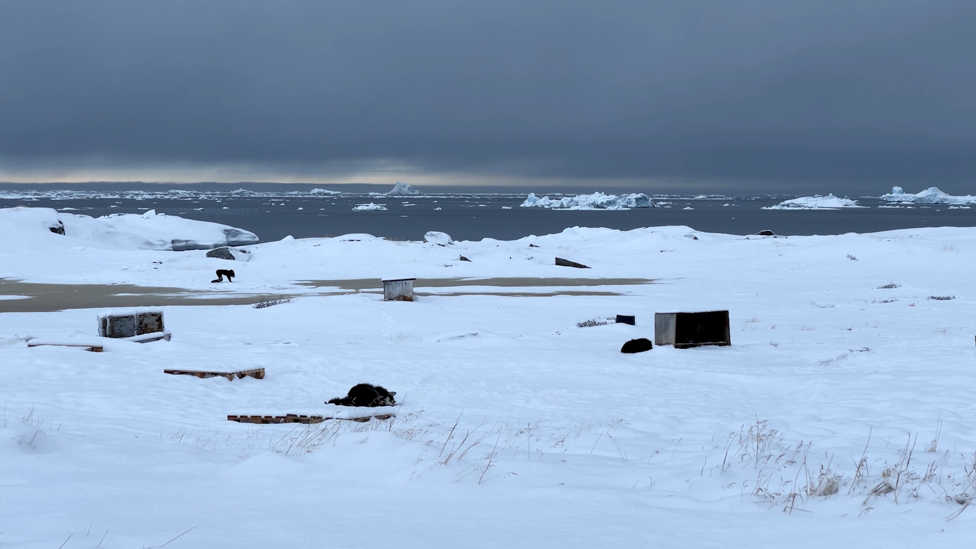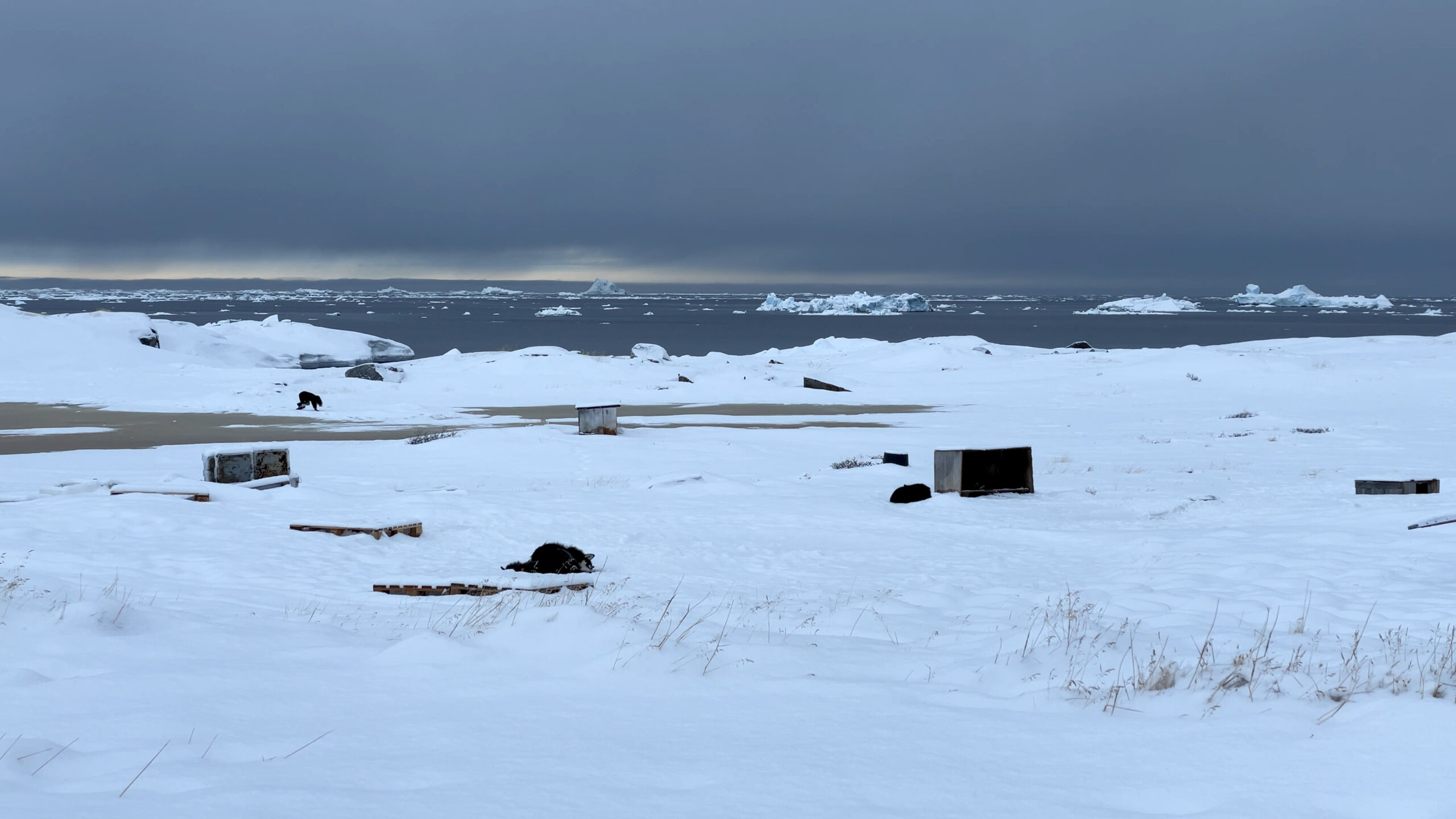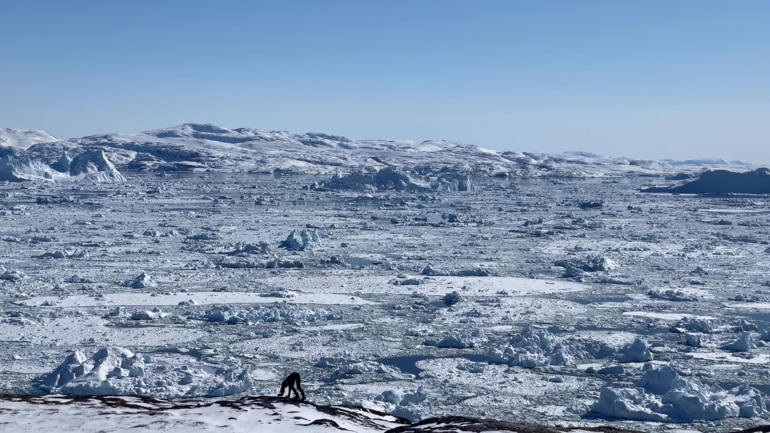 The series of performances initiated at the Oqaatsut residency is an extension of my earlier creative explorations. In a post-humanist spirit, I look at the relationship of humans to other species. This time I was interested in dogs, which occupy a special place in Greenland, both as service animals and as characters in tales and legends. Dogs are unique creatures. As the only domesticated animals in Greenland, they provided a link between the world of humans and wildlife. The short videos capture both my romantic longing to be closer to nature and touch on the theme of the transformation of humans into animals, often present in Greenlandic legends. During the expeditions, which lasted throughout the residency, I experienced the terrain on two as well as four limbs, which expanded the context of the work to include the experience of the body, not only at the level of perceived cold, but also in relation to the sense of balance and non-human perception. In addition, each shot is accompanied by an aura of mystery and ambiguity. Depending on the scale, the figure appears as a hard-to-define, four-legged creature, a human-animal hybrid, a woman-dog, a disappearing black shape.