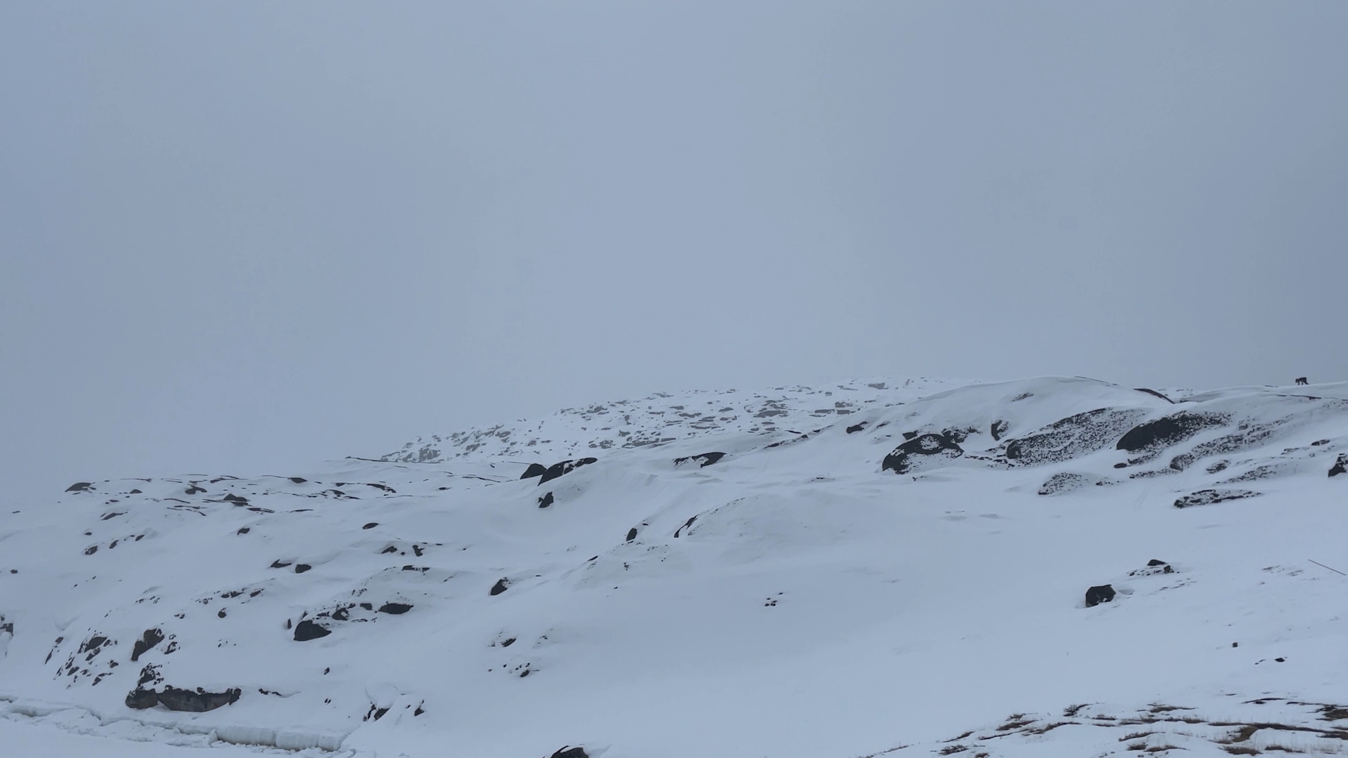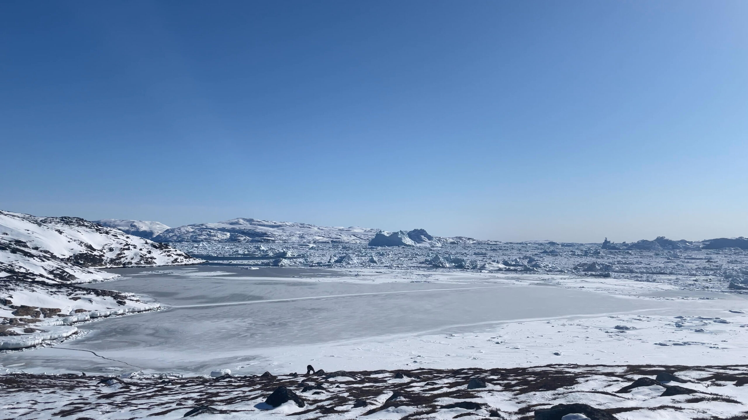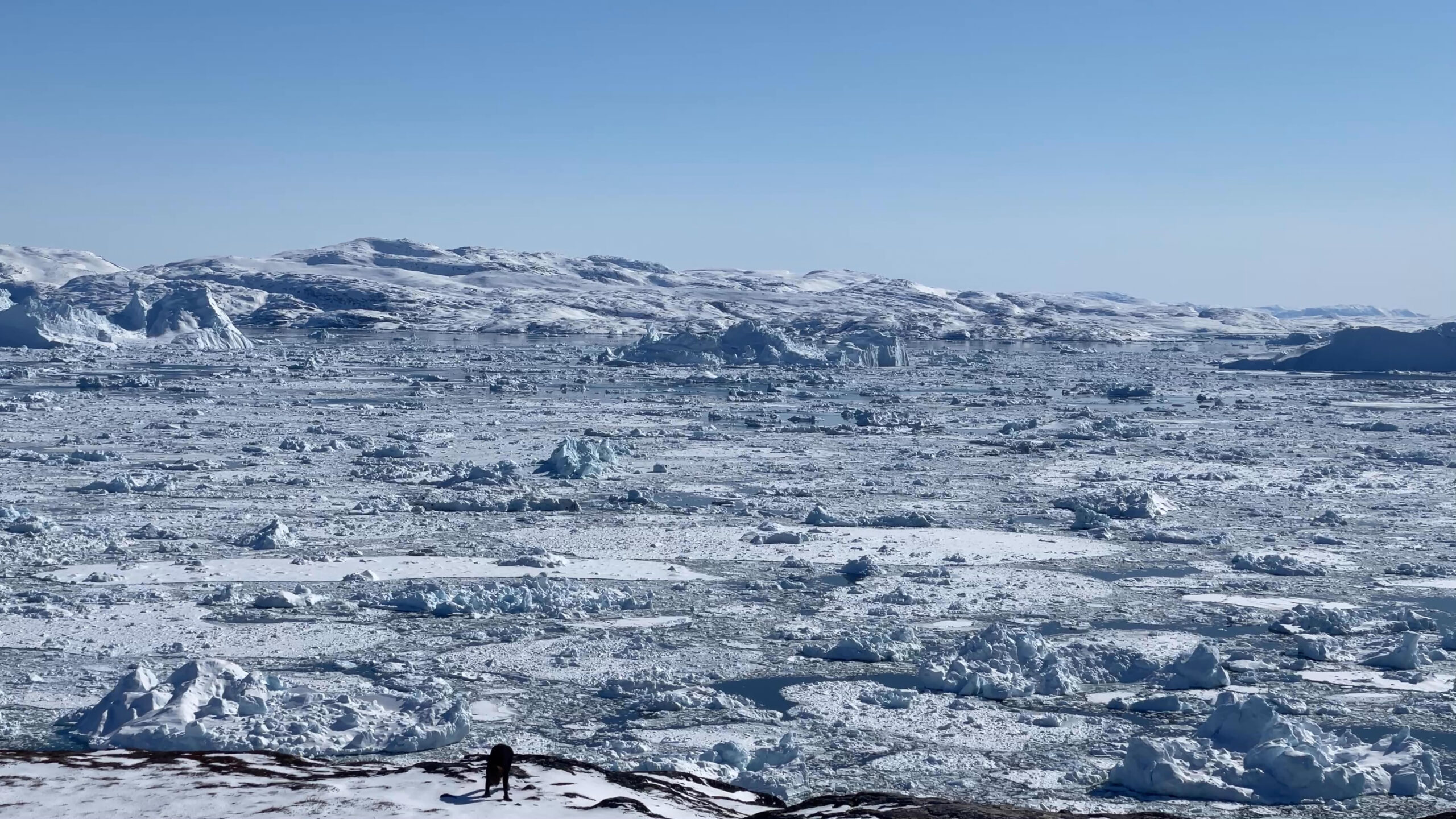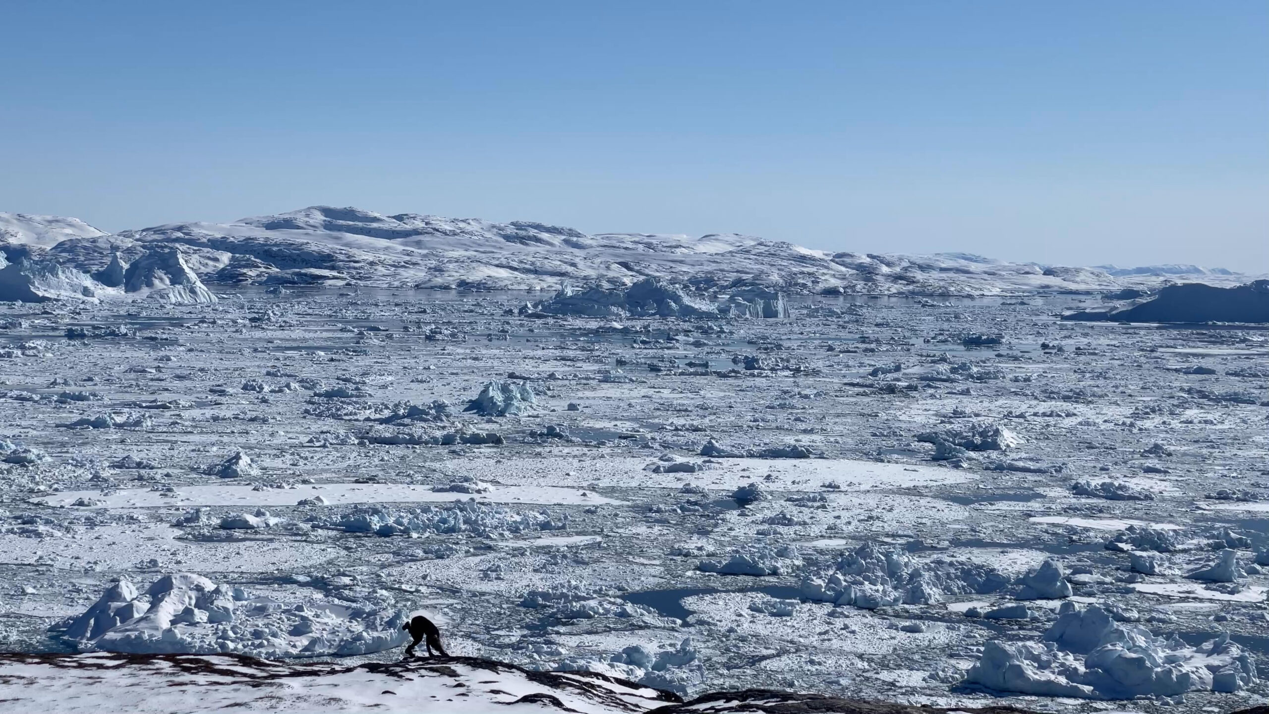 The series of performances initiated at the Oqaatsut residency is an extension of my earlier creative explorations. In a post-humanist spirit, I look at the relationship of humans to other species. This time I was interested in dogs, which occupy a special place in Greenland, both as service animals and as characters in tales and legends. Dogs are unique creatures. As the only domesticated animals in Greenland, they provided a link between the world of humans and wildlife. The short videos capture both my romantic longing to be closer to nature and touch on the theme of the transformation of humans into animals, often present in Greenlandic legends. During the expeditions, which lasted throughout the residency, I experienced the terrain on two as well as four limbs, which expanded the context of the work to include the experience of the body, not only at the level of perceived cold, but also in relation to the sense of balance and non-human perception. In addition, each shot is accompanied by an aura of mystery and ambiguity. Depending on the scale, the figure appears as a hard-to-define, four-legged creature, a human-animal hybrid, a woman-dog, a disappearing black shape.