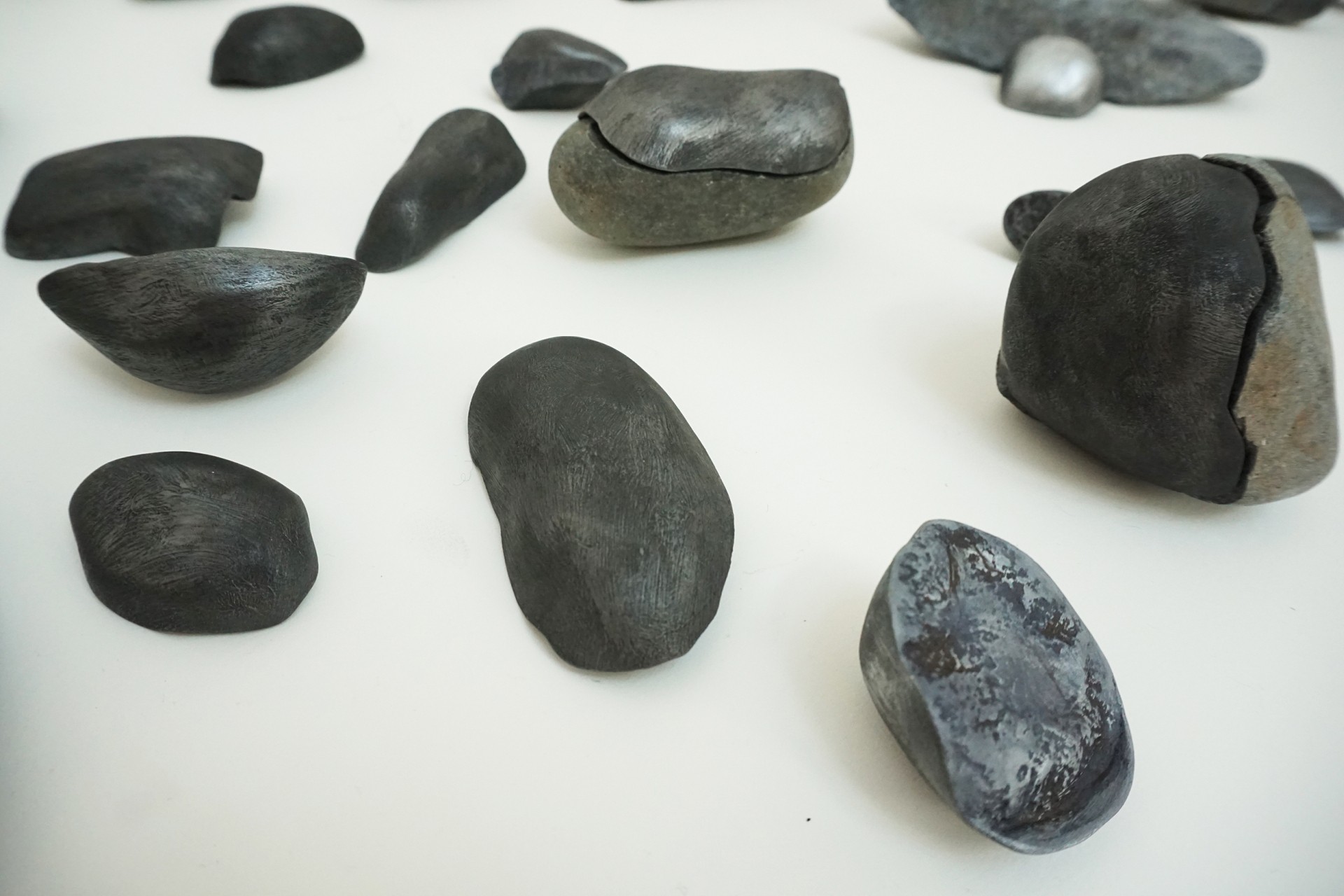 w kadrze wideo, z drugiej jest przykładem nieudanej ingerencji w naturę. Uszkodzone kamyki, które znalazłem w okolicach Hofsos, sprowokowały mnie do ich naprawy. Brakująca część kamienia, którą wyrzeźbiłam jest sztuczna, ma inny kolor i strukturę, jest swego rodzaju substytutem, poprawianie (naprawianie kamieni) przyrody wydaje się działaniem chybionym.