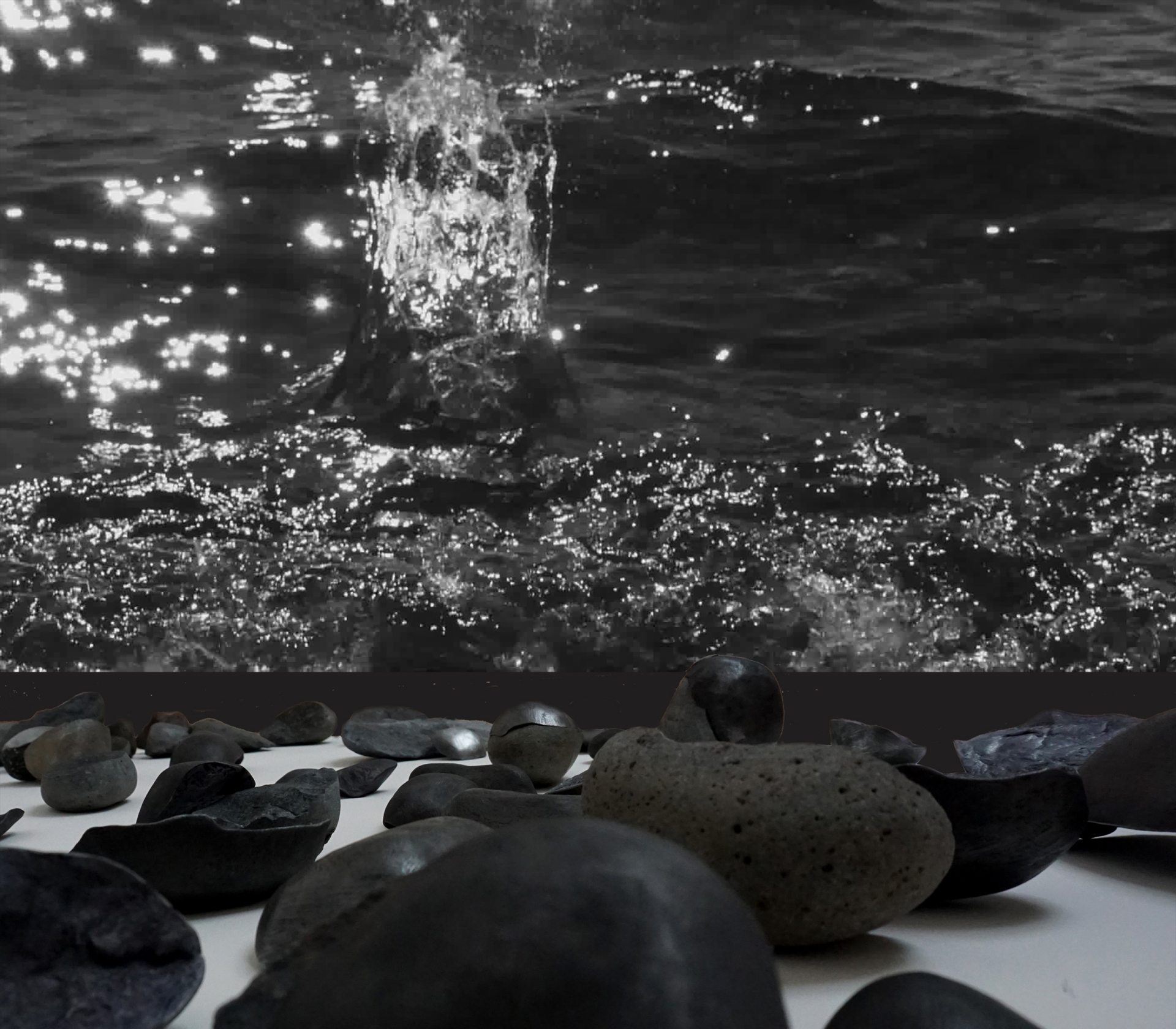 in the video frame, and on the other exemplifies an unsuccessful interference with nature. The damaged pebbles, which I found around Hofsos, provoked me to repair them. The missing part of the stone which I sculptured is artificial, has a different colour and structure, is a kind of substitute. Therefore, interfering with (an unnatural process of making waves) as well as correcting (repairing stones) nature seems an abortive activity.