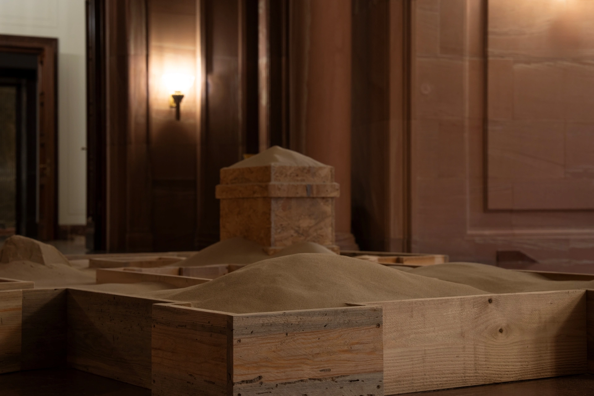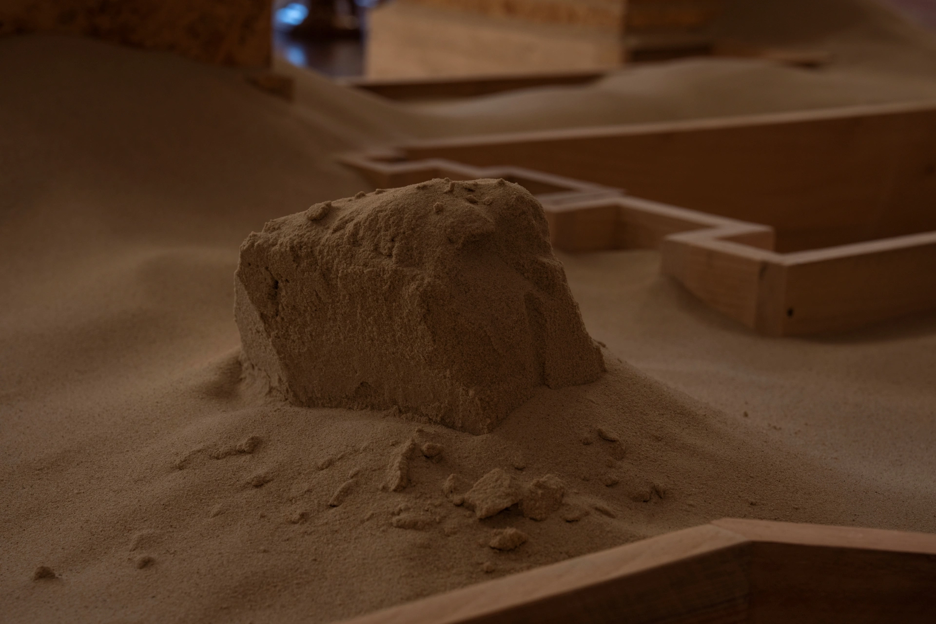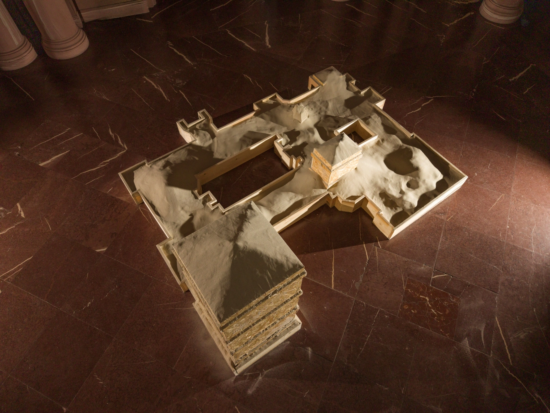 „Entropy-Neg-Entropy installation is a reflection on the transformation of social ideas and the roles of architecture. In it, Sonia Rammer juxtaposes the symbolic beginning of the Castle with the “ruins” she has created and visualizes its post-historical future. Formally, the artist refers to the outline of the foundations of the former Imperial Castle in Poznań. She reproduces it to scale, juxtaposing a wooden structure—reminiscent of construction formwork—with the function of a sandbox. The collapse of the structure is a creative process, the beginning of a new reality in which the original message of the building, based on militaristic myths and power over space, gives way to functions far removed from ideology.